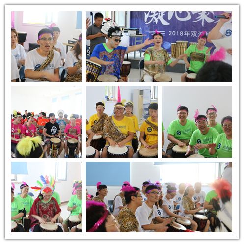 经过之前简单的热身之后,大家和教练一起学习如何打非洲鼓点。在正式打鼓先来装扮下自己,家人们别出心裁,帮助伙伴们化妆、设计服饰。别说,经过一番精心打扮,还真有点非洲人的意思呢!