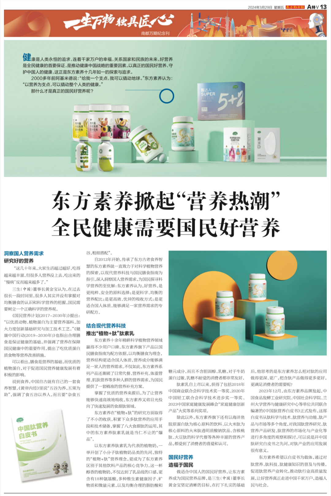 东方素养掀起“营养热潮” 健康是人类永恒的追求,连着千家万户的幸福,关系国家和民族的未来。好营养是全民健康的首要保证,是推动健康中国战略的重要因素。以真正的国民好营养,守护中国人的健康,这正是东方素养十几年如一的探索与追求。 2000多年前阿基米德说:“给我一个支点,我可以撬动地球。”东方素养认为:“以营养为支点,可以撬动整个人类的健康。” 那什么才是真正的国民好营养呢? 01 洞察国民营养需求 研究好的营养 “这几十年来,大家生活越过越好,吃得越来越丰富,但很多人营养没上去,吃出来的‘慢病’反而越来越多了。” 三生(中国)董事长黄金宝认为,在过去很长一段时间里,很多人其实并没有掌握对均衡膳食的认识和科学营养的把握,国民需要树立一个正确科学的营养观。 可以看出,膳食是营养的基础,而优质的植物蛋白,对于促进国民营养健康发展有着积极的影响。 说到食养,中国自古就有自己的一套食养智慧。《黄帝内经》里说“五谷为养,五果为助”,强调了食五谷以养人,而且要“杂食五谷,粗细搭配”。 自2012年开始,传承了东方古老食养智慧的东方素养就一直致力于对科学植物营养的探索,以现代营养科技与国民膳食指南为指引,深入洞察国人营养需求,为国民探寻科学营养的最优解:东方素养认为,好营养,是更纯粹、安全的原料选择;是更科学、均衡的营养配比;是更高效、优异的吸收方式;是更适合国人体质,能够满足一家营养需求的专研配方。 02 综合现代营养科技 推出“植物+肽”肽素乳 东方素养十余年精耕科学植物营养领域赢得不少用户口碑。东方素养旗下产品以国民膳食指南为配方依据,以均衡膳食为理念,营养结构更适合国人体质,营养成分能够满足一家人的营养需求。不仅如此,东方素养系列产品还兼顾了日常代餐、营养补充、体重管理、肌肤营养等多种人群的营养需求,为国民提供了一套精准的营养解决方案。 东方素养在“植物+肽”的研究方面取得了不小的收获,积累下众多肽营养的应用手段和技术储备,掌握了八大食源肽的运用,其中的东方素养肽素乳就是当仁不让的“爆品”。 肽素乳自上市以来,获得了包括2018年中国商业联合会科学技术奖一等奖、2020年中国轻工联合会科学技术进步奖一等奖、2023中国家庭健康发展峰会“家庭健康创新产品”大奖等系列奖项。 除此以外,东方素养旗下还有以海洋鱼胶原蛋白肽为核心原料的饮料、以大米肽为核心原料的大米肽透明质酸钠饮品、含核桃肽、大豆肽的科学代餐等各种丰富的营养产品,都受到了消费者的喜爱和认可。 03 国民好营养,造福于国民 做适合中国人的国民好营养,让东方素养成为国民营养品牌,是三生(中国)董事长黄金宝坚定清晰的目标,在打下扎实的基础后,他思考的是东方素养怎么把对肽的应用做得更深、更广,把含肽产品做得更多更好,更满足消费者的需要呢? 2023年12月,由东方素养品牌发起,中国食品发酵工业研究院、中国社会科学院、兰州大学营养与健康研究中心等单位共同联合编著的《中国肽营养白皮书》正式发布,这部白皮书从肽科学与技术、肽营养与功能、肽产品与市场等多个角度,对我国肽营养研究、肽营养产品研发、肽营养的市场化与产业化等进行多角度的观察和探讨,可以说是开中国肽研究白皮书之先河,对肽产业的应用发展很有意义。 东方素养希望以白皮书为载体,通过对肽营养、肽科技、肽健康知识的普及与传播,促进肽营养产业转化,推动肽行业高质量发展,让好营养真正走进中国千家万户,造福人民与社会。