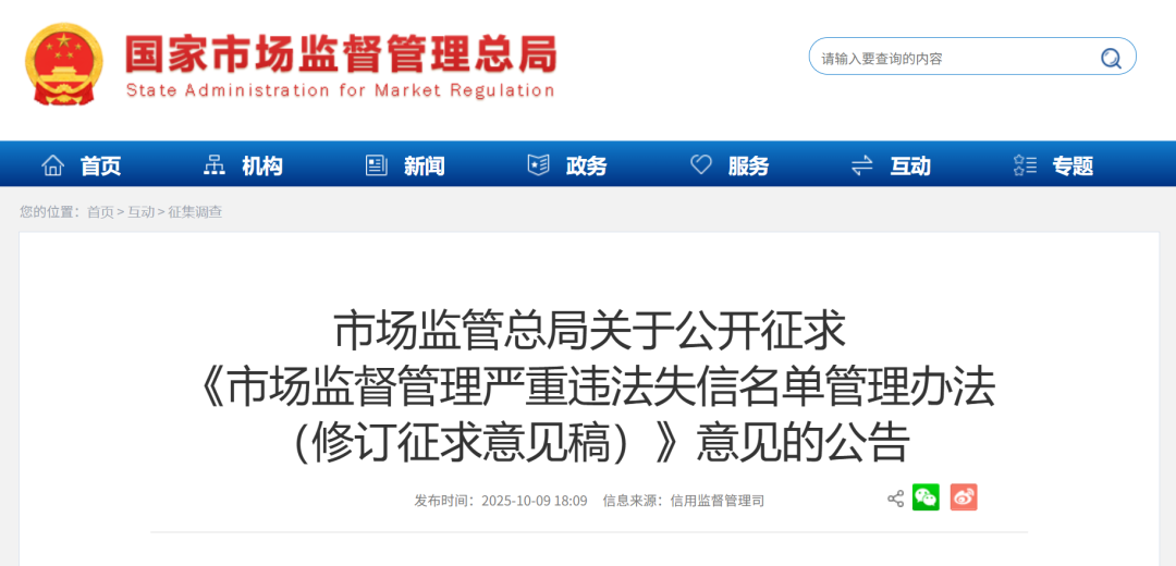 10月9日,国家市场监督管理总局对《市场监督管理严重违法失信名单管理办法(修订征求意见稿)》(以下简称《办法》)进行公开征求意见,意见反馈截至11月10日。严重