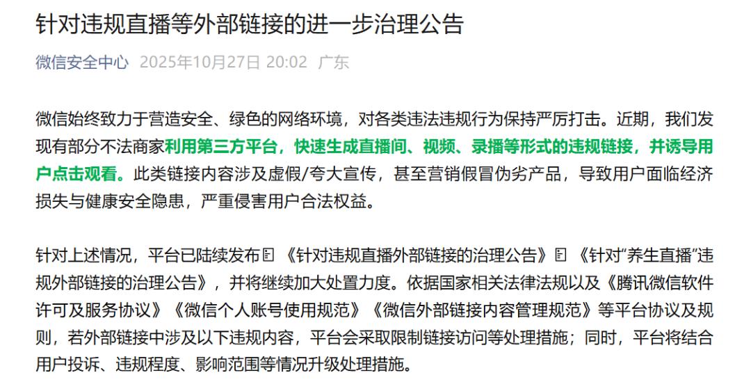 3月7日,发布《针对“养生直播”违规外部链接的治理公告》,若外部链接中的直播内容涉及违规发布医疗、药品、保健食品等信息,微信端会限制链接访问。